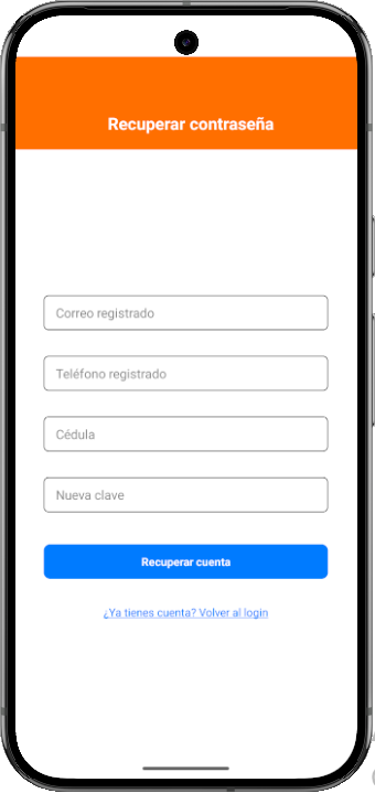 Una vez que ingreso la información correcta toque el botón recuperar cuenta, con esta nueva contraseña podrá ingresar al App.