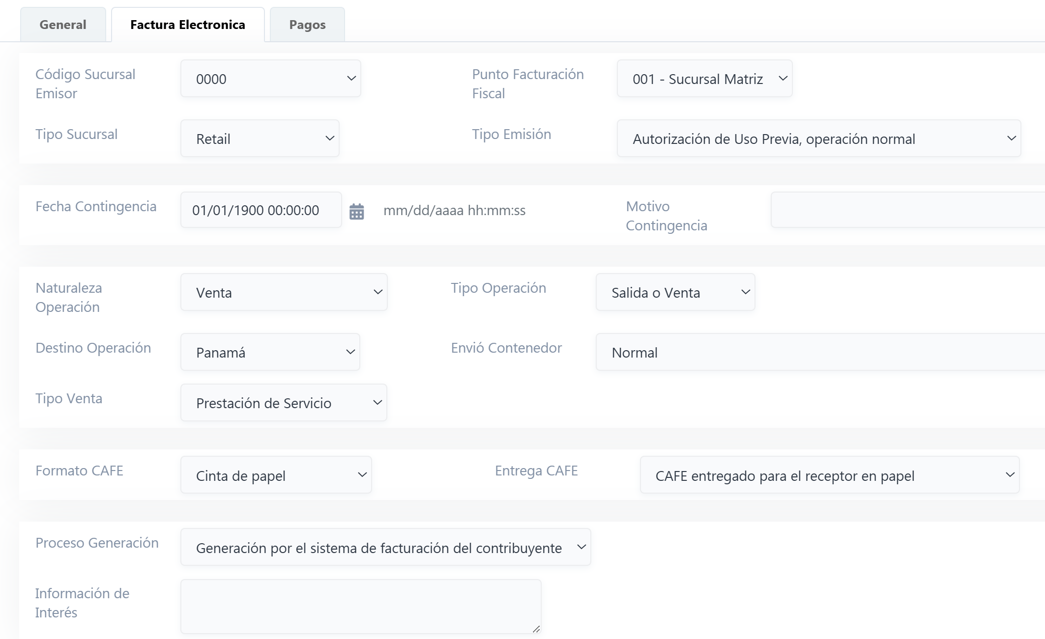 Factura Electrónica: En esta pestaña se encuentran los datos que son obligatorios para la factura Electrónica, esta información en general debe mantenerse tal cual ya que viene de una configuración global del sistema y solo debe ser modificada en caso de alguna peculiaridad de la venta.